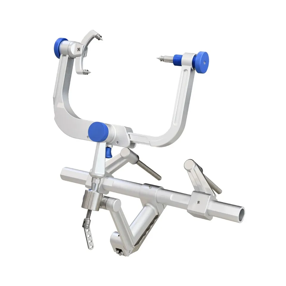 Glavno ohišje je več-dimenzionalna nastavljiva struktura nosilca: fiksni okvir v-obliki U na vrhu je opremljen s fino{2}}nastavljivo vpenjalno komponento glave, ki se lahko prilagodi različnim oblikam glave, glava pa je trdno pritrjena z zaklepnim gumbom. Spodaj povezovalna palica in prilagoditveni mehanizem podpirata prilagodljivo nastavitev vzglavja glede na prostorski kot in višino, kar lahko natančno ustreza zahtevam kirurškega položaja in zagotavlja jasnost izpostavljenosti kirurškega območja.